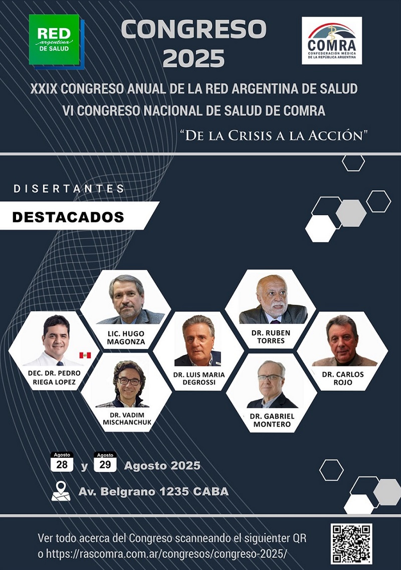 Bajo el lema “De la crisis a la acción”, la Confederación Médica de la República Argentina (COMRA) y la Red Argentina de Salud (RAS) llevarán adelante, en forma conjunta, el VI Congreso Nacional de Salud y el XXIX Congreso Anual de la RAS los días 28 y 29 de agosto de 2025. El encuentro se desarrollará en la sede de la COMRA, ubicada en Av. Belgrano 1235, Ciudad de Buenos Aires.