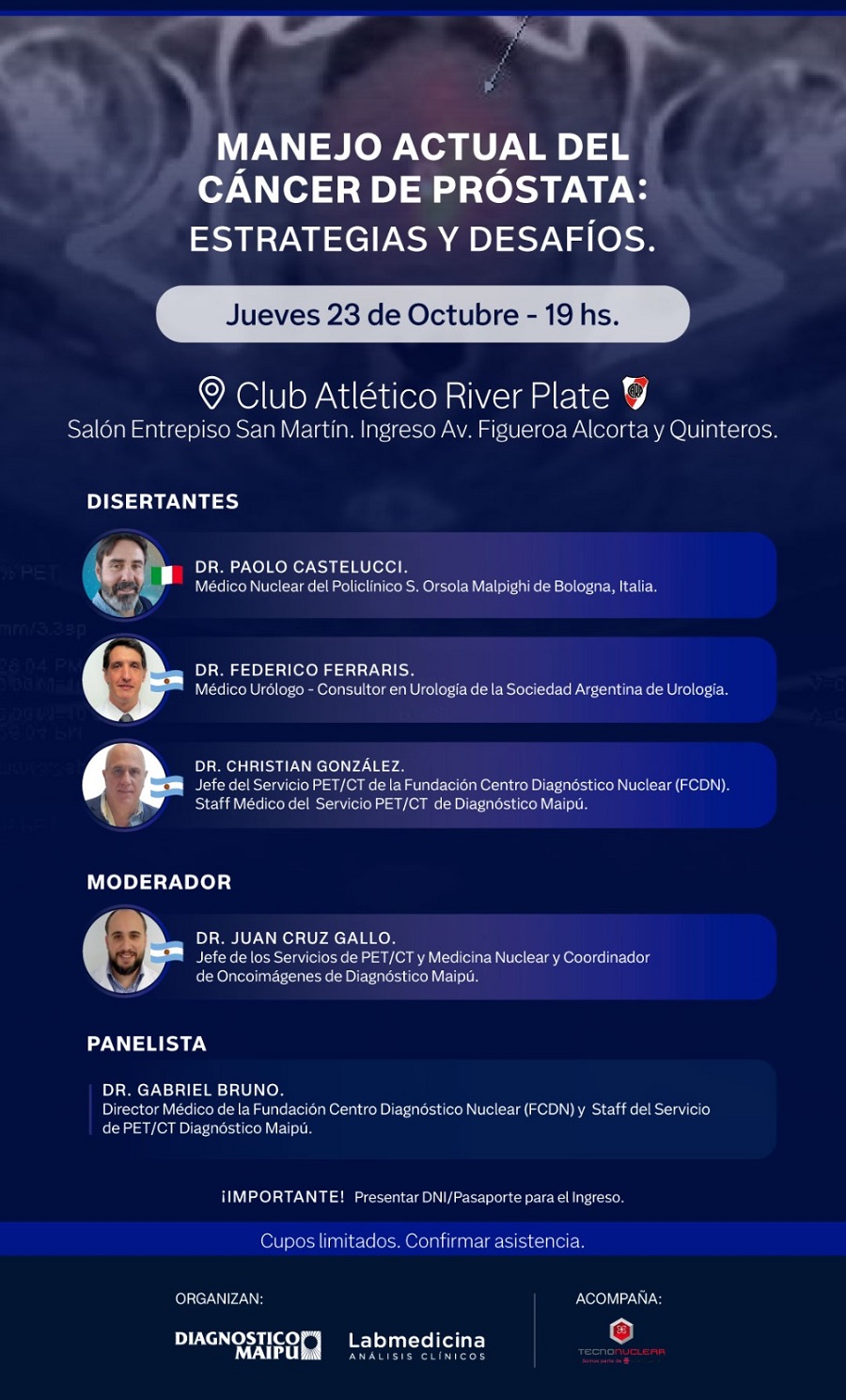 Con el propósito de actualizar conocimientos y debatir sobre los desafíos actuales en el abordaje del cáncer de próstata, se realizará una jornada académica titulada “Manejo actual del cáncer de próstata: estrategias y desafíos”, organizada por Diagnóstico Maipú y Labmedicina. El encuentro tendrá lugar el jueves 23 de octubre a las 19 horas, en el Club Atlético River Plate (Salón Entrepiso San Martín, ingreso por Av. Figueroa Alcorta y Quinteros).