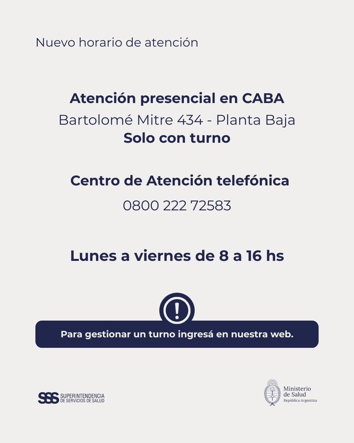La Superintendencia de Servicios de Salud informa que, a partir de hoy, se amplía el horario de atención al beneficiario en su Centro de Atención Personal, ubicado en Bartolomé Mitre 434, Ciudad de Buenos Aires, así como en la línea telefónica de contacto 0800-222-72583 (SALUD).