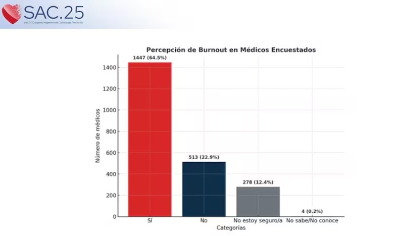 El burnout —un cuadro de agotamiento crónico caracterizado por fatiga, desmotivación y pérdida de eficacia profesional— fue evaluado mediante un cuestionario de autopercepción y una escala breve de detección. Aunque no constituye un diagnóstico clínico, el instrumento permite dimensionar el impacto del estrés laboral en el ámbito médico.